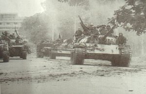 チュー氏に代わって副大統領が臨時大統領となったが、交渉推進派の代表と衆目が一致していたズオン・バン・ミン将軍に代わるまで、実にまる1週問が空費されている。その問、前述の回線を使ったレポートを続けながら、小田カメラマンと私は毎日早起きして、北の機甲部隊が南下しているサイゴン東方の国道1号線の取材に時間を傾けた。
