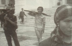 30日、未明からの取材手帳の走り書き。・・・・最後のヘリコプターが去った米大使館前の路上に引き出されたソファーで、丸裸の赤ん坊を抱えて眠る若い母親。サイゴン河埠頭に集まり続ける、土壇場の脱出を求める人々。炎上して漂流する海軍舟艇。そこへ突然、解放戦線旗を振ってバイクが走り抜ける。どこからともなく解放戦線旗を掲げたジーブが船着き場に走り込み、飛び降りたシャツ姿の青年が群衆に話し始める。ことが終わったことを説得しているのだろう。群衆が散り始める。……後に明らかにされたところによると、私服で市内に潜入していた「特別攻撃部隊」の行動であり、彼らの任務には、電力や水道など基幹となる拠点や、サイゴンを取り巻く河の橋を確保することも含まれていた…次の瞬間には、M16ライフルを乱射しながら走り抜ける旧政府軍のジープ。身をかがめて建物の陰に避難すると、次の大通りでは北の兵士を載せたトラックを市民が取り囲むようにして対話が始まっている。空港および国道1号方面に絶えない黒煙。あちこちで響く爆発音。市役所前で市街戦の戦闘隊形に入る北軍歩兵部隊。自動小銃の乾いた連射音。そうした光景をフィルムに収めながら正午過ぎに大統領官邸に着くと、一群の戦車が既に休息体制に入っていた。
