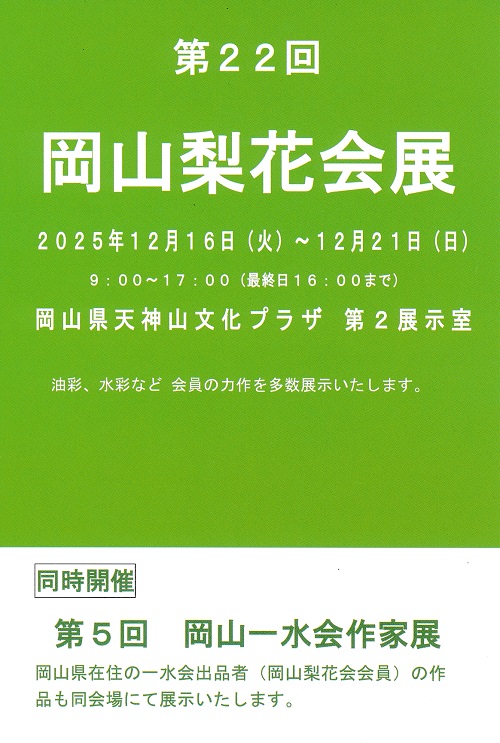 次の通り第22回、岡山梨花会展及び第5回、岡山一水会作家展を開催致します。